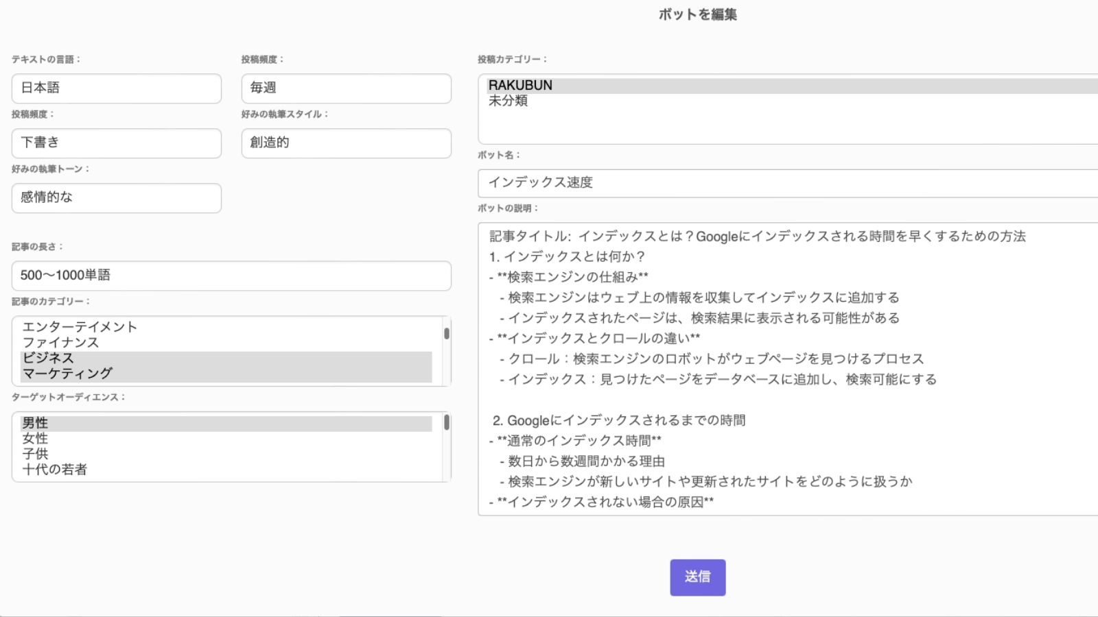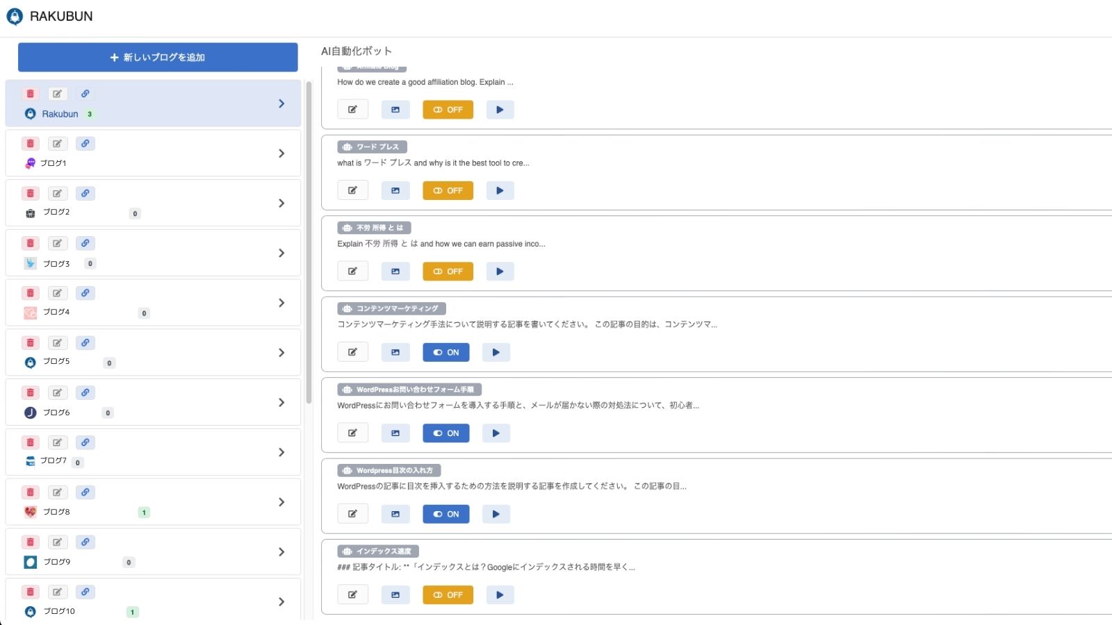 Botは無制限に作成可能です。また、自動投稿機能のオンオフを簡単に管理でき、記事の即時生成にも対応しています。